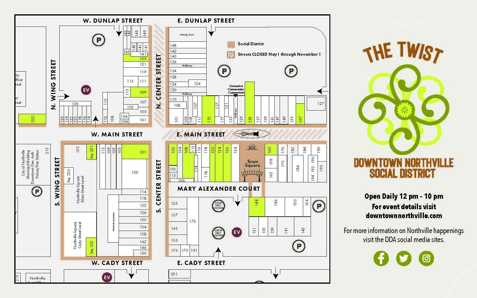 Created during the pandemic to keep Downtown Northville lively and connected, The Twist has become a favorite for both visitors and local businesses. This pedestrian-friendly social district transforms portions of Town Square, Main Street between Wing and Hutton, and Center Street between Dunlap and Cady into safe, car-free zones.