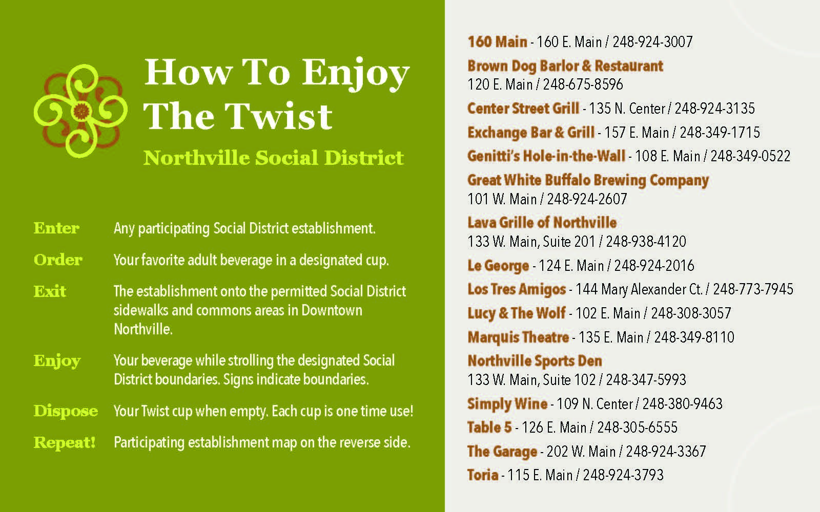 The Twist includes many of Downtown Northville’s most beloved spots. Participating restaurants and bars include: